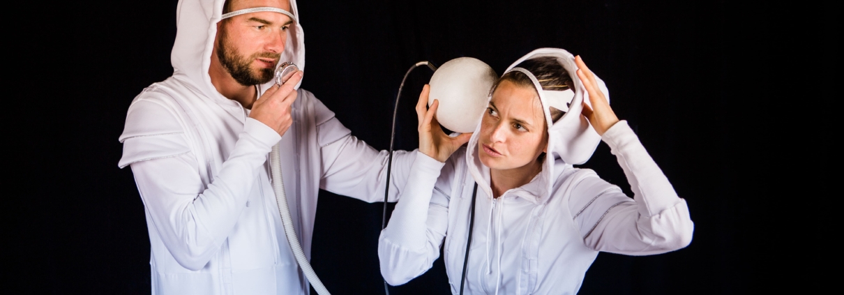 Avec Allo Cosmos, Marc de Blanchard et Fanny Paris livrent un spectacle étonnant : une science-fiction musicale et chorégraphiée, mélange de boucles électroniques, de sons synthétiques des années 80-90, de danse et de mapping vidéo. Sur scène, le décor est posé : dans un petit laboratoire étrange, on découvre deux scientifiques dont la mission principale sera de trouver une nouvelle planète habitable pour l’être humain. Au fil de leurs expériences et de leurs explorations qui les mèneront tout droit vers les étoiles, se révèle un univers pop, coloré et décalé, peuplé d’animaux inconnus et de végétaux étranges… Tout un monde en suspension, propice à la surprise, à l’étonnement, à la poésie comme à l’absurde. On y découvre, non sans drôlerie, les premiers pas de l’Homme dans le cosmos, les corps en apesanteur, entre lourdeur et légèreté, lenteur et rapidité. De l’infiniment petit à l’infiniment grand, c’est l’histoire d’une incroyable épopée cosmique…
